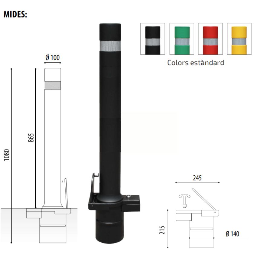 Su sistema extraíble con base empotrada permite retirar la pilona de forma rápida y sencilla cuando sea necesario, facilitando el acceso puntual de vehículos autorizados o la reorganización del espacio. Esta característica la convierte en una opción ideal para zonas donde se requiere control de acceso flexible sin renunciar a la seguridad.